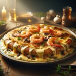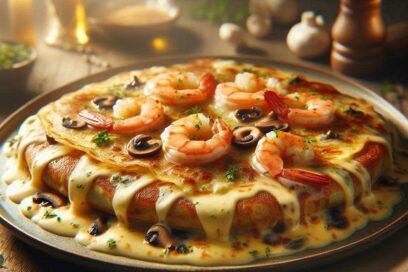 Crepe de gambas y setas gratinado